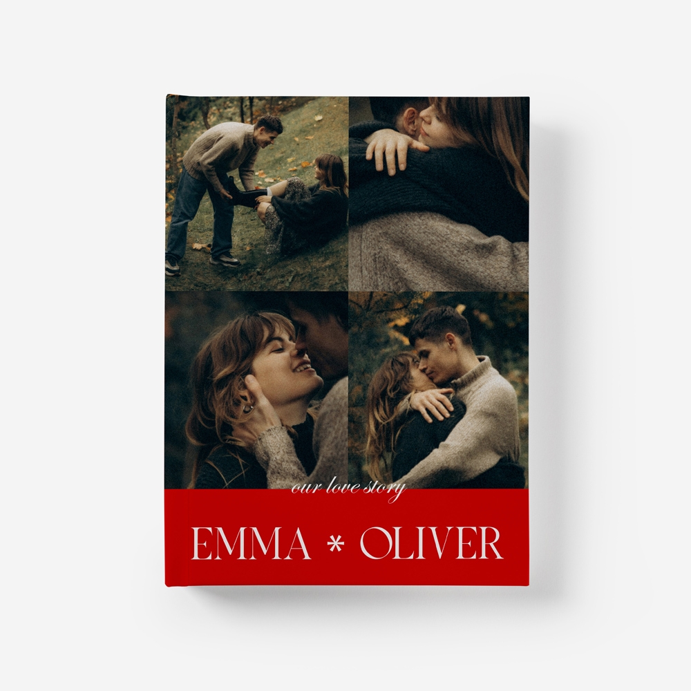 Transforma o vosso romance numa edição de colecionador com o tema Love Story. Com uma estética puramente editorial e cinematográfica, este álbum destaca a vossa fotografia favorita em grande plano, complementada por uma faixa vermelha intensa e tipografia elegante. É a escolha perfeita para casais que querem eternizar os seus capítulos com o glamour e o protagonismo de uma capa de revista.