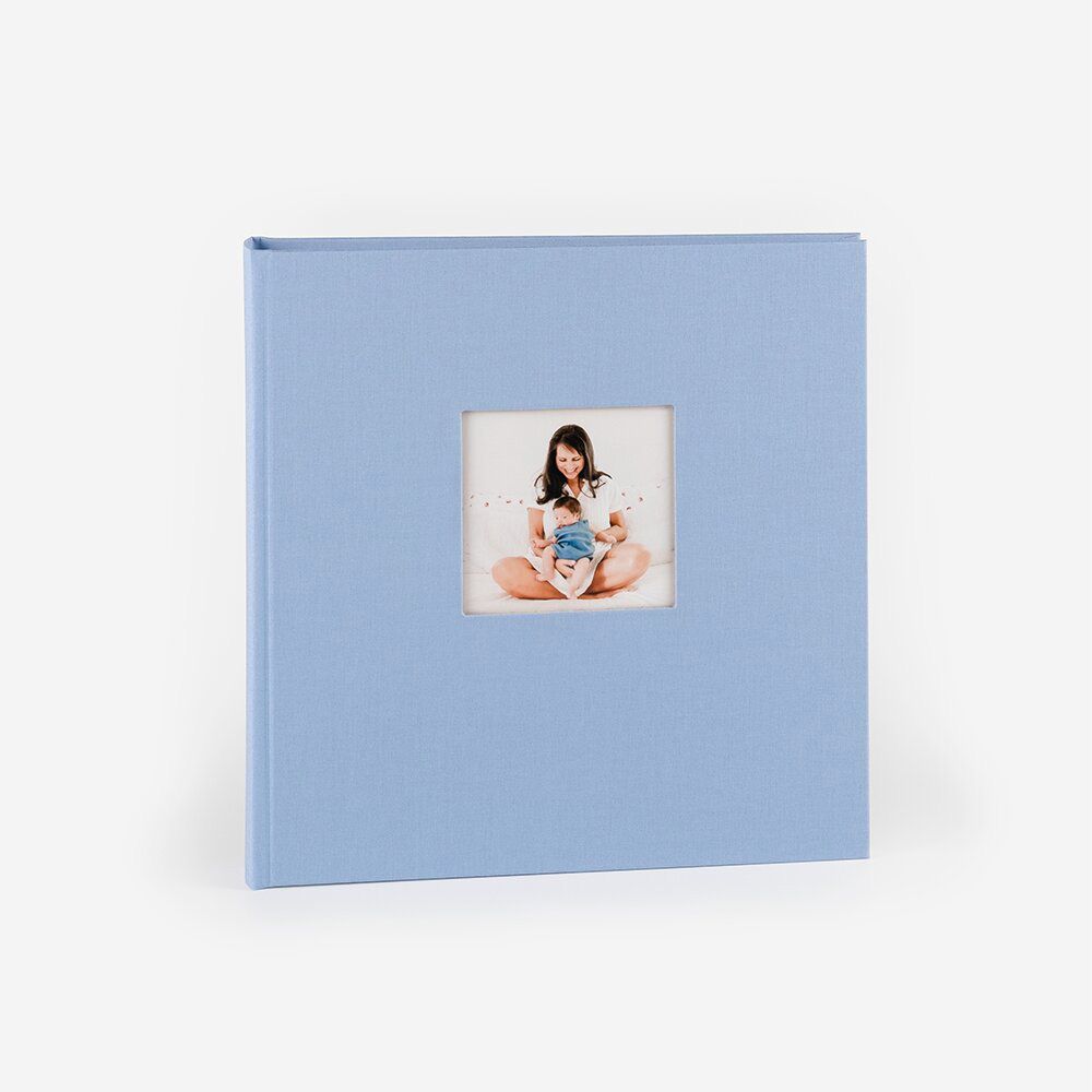 A capa em Linho dos Álbuns Analógicos com janela apresenta uma abertura para destacar uma fotografia de 10x15cm. Disponível em sete cores: azul, bege, cinza, rosa, castanho, mostarda e verde.