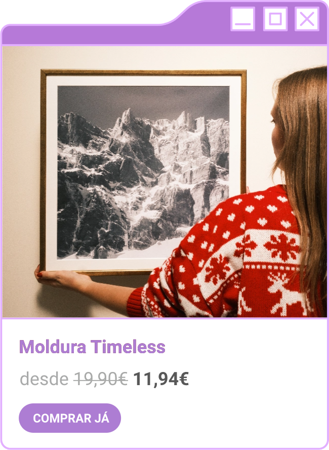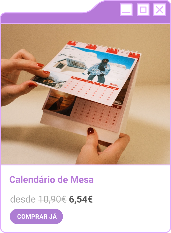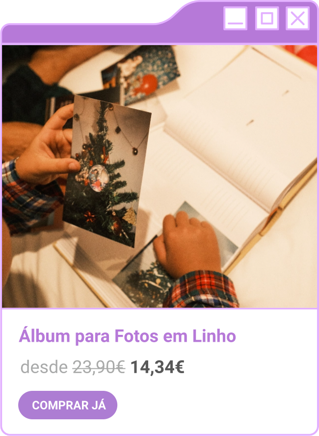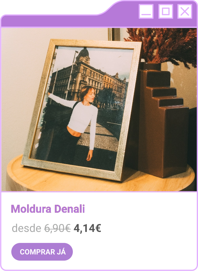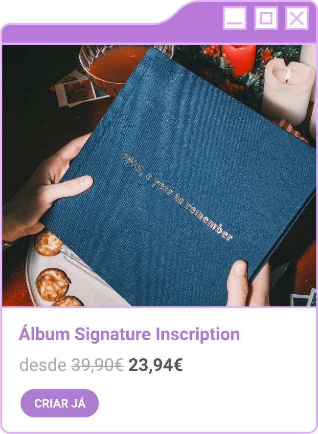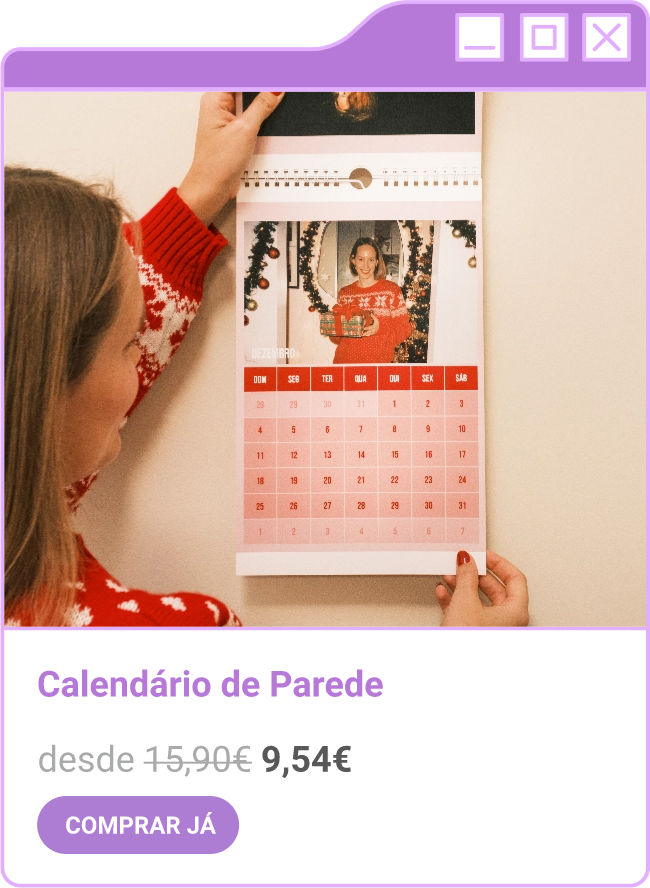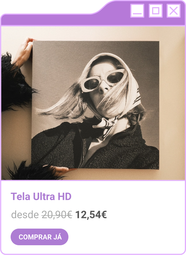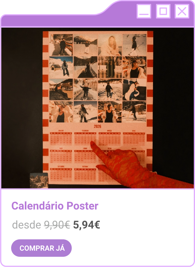 Condições da campanha: Campanha de 30% de desconto em todo o site sem valor mínimo de compra mediante a submissão do código FORTNIGHT30, e 40% de desconto em compras superiores a 60€ mediante a submissão do código FORTNIGHT40, válidas de 17/11/2025 a 01/12/2025. Campanhas não acumuláveis com outras campanhas/vouchers em vigor. Packs de Fotos Standard 10x15cm e 15x20cm, Fotos 24h, Telas Sintéticas e produtos de Stock Off não incluídos.