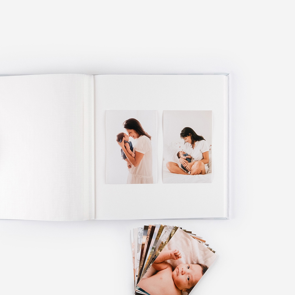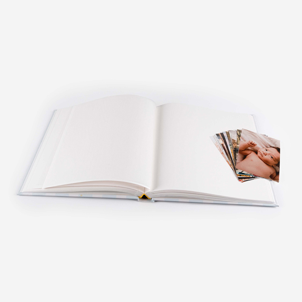 A capa dos Álbuns Analógicos Infantis possui uma impressão artística com relevo dourado e estão disponíveis em azul e Rosa.